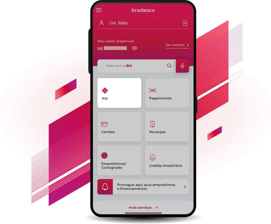 Para você se cadastrar no sistema PIX Bradesco, abra sua conta no aplicativo do Bradesco e em seguida aperte no ícone do PIX que deve aparecer na tela inicial do app. Caso não apareça, entre no menu e selecione o PIX.
